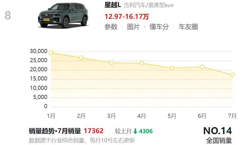 据懂车帝数据,1月至7月,星越L累计销量为16.3万辆,在所有车型中拿到第8名。