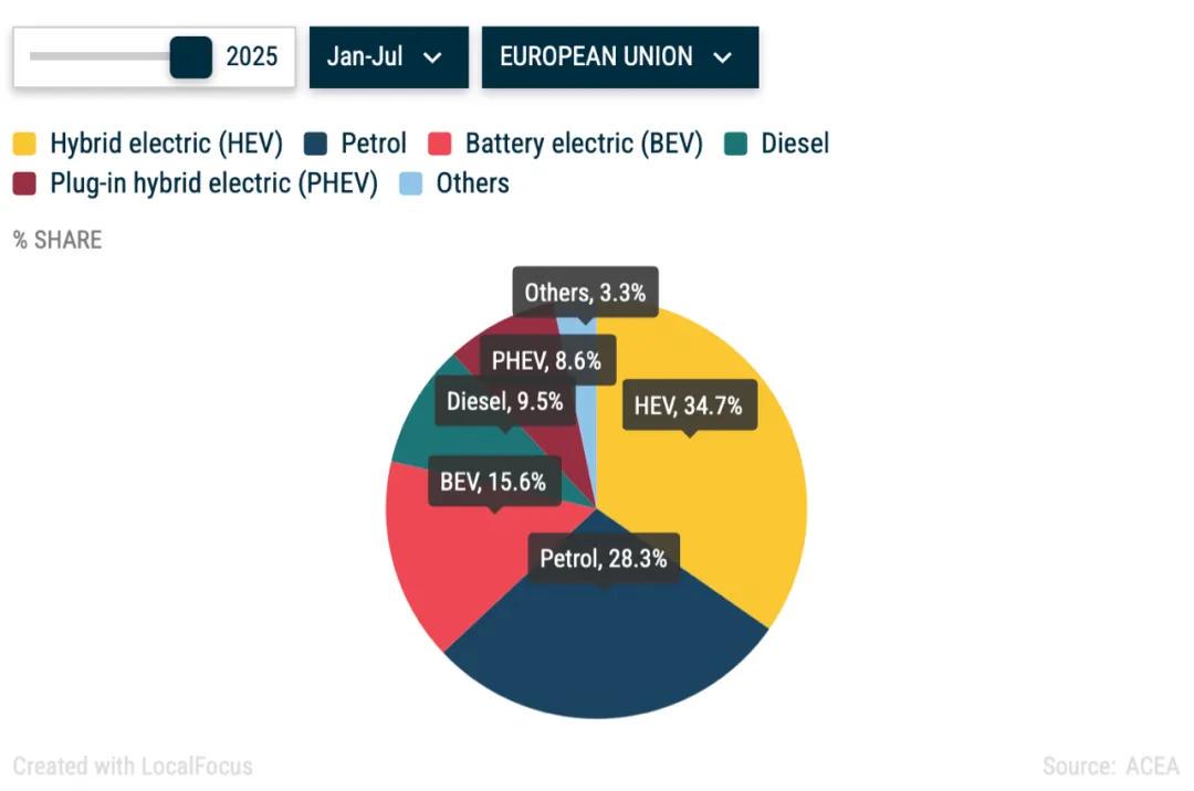 ACEA数据显示,今年1-7月份,欧洲BEV份额为15.6%,PHEV为8.6%,比去年同期增加了4.5个百分点。如果把两者相加,占比则达到24.2%,这一市场体量在欧洲位列第三,仅次于HEV和汽油车。