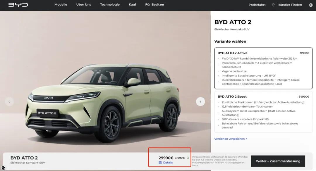 可能与大家过往的认知有所不同,比亚迪在欧洲的定价策略并不是传统的性价比路线。以德国为例,ATTO 3起售价高达3.8万欧元,约合人民币32.5万元,是国内起售价(11.58万元)的2.8倍;即使是ATTO 2红腾网,起售价也达到2.9万欧元(约合人民币24.9万元),也远高于国内7.48万元的起售价。