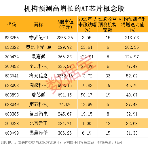 从未来增长潜力来看,据数据宝统计,根据5家及以上机构一致预测,今明两年净利润增速均有望超30%的AI芯片概念股有11只。机构预测净利润增速均值100%以上的仅3只,分别是寒武纪-U、奥比中光-UW、景嘉微。